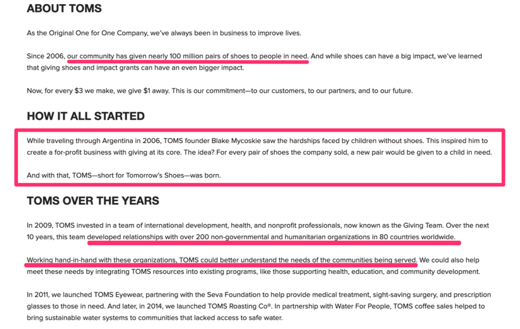 История бренда включает в себя все три этапа, о которых мы говорили ранее. Рассматривайте историю бренда как расширенную версию «почему» в вашем программном заявлении. Это объяснение того, почему вы занимаетесь бизнесом, должно нравиться вашему целевому рынку и быть выражено в голосе вашего бренда. Вот отличный пример от TOMS.