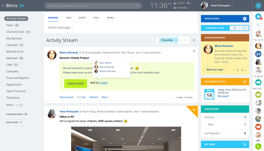 Кроме того, функции социального сотрудничества Bitrix24 облегчают координацию действий волонтеров.