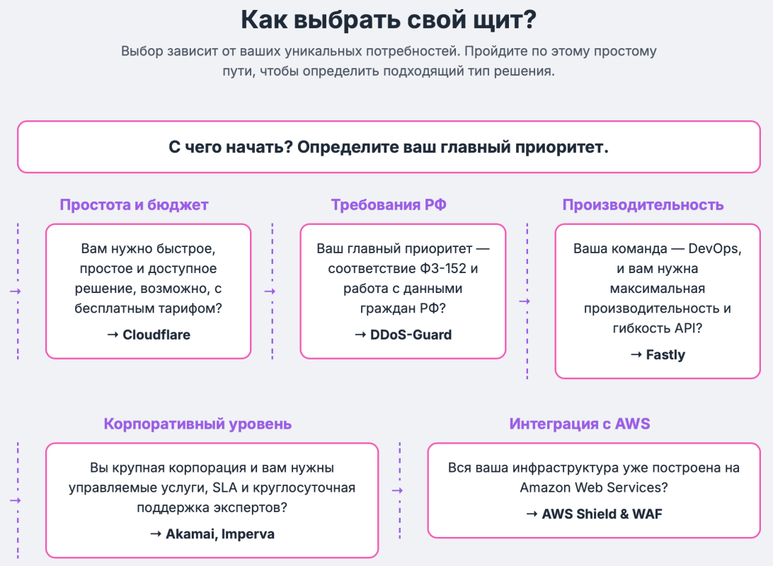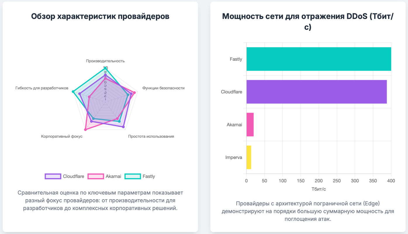 Выбор архитектуры защиты напрямую отражает историю и рыночный фокус провайдера. Компании, выросшие из CDN (Cloudflare, Fastly), изначально строили свои глобальные распределенные сети для ускорения контента, поэтому добавление функций безопасности на уже существующую «пограничную» инфраструктуру стало для них естественным шагом. Этот подход объясняет их фокус на низкой задержке и интегрированных с производительностью услугах, которые легко масштабируются и доступны для массового рынка.8